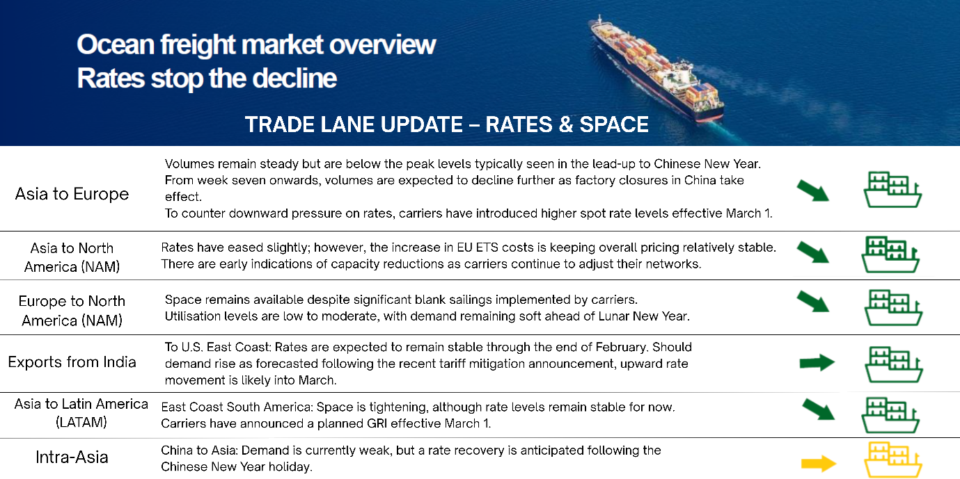 We have now been informed that the first carriers, including Maersk, Hapag-Lloyd, and CMA CGM, have started to reinstate services through the Suez Canal. As a result, certain upcoming shipments may once again transit this route, depending on operational requirements and carrier discretion.